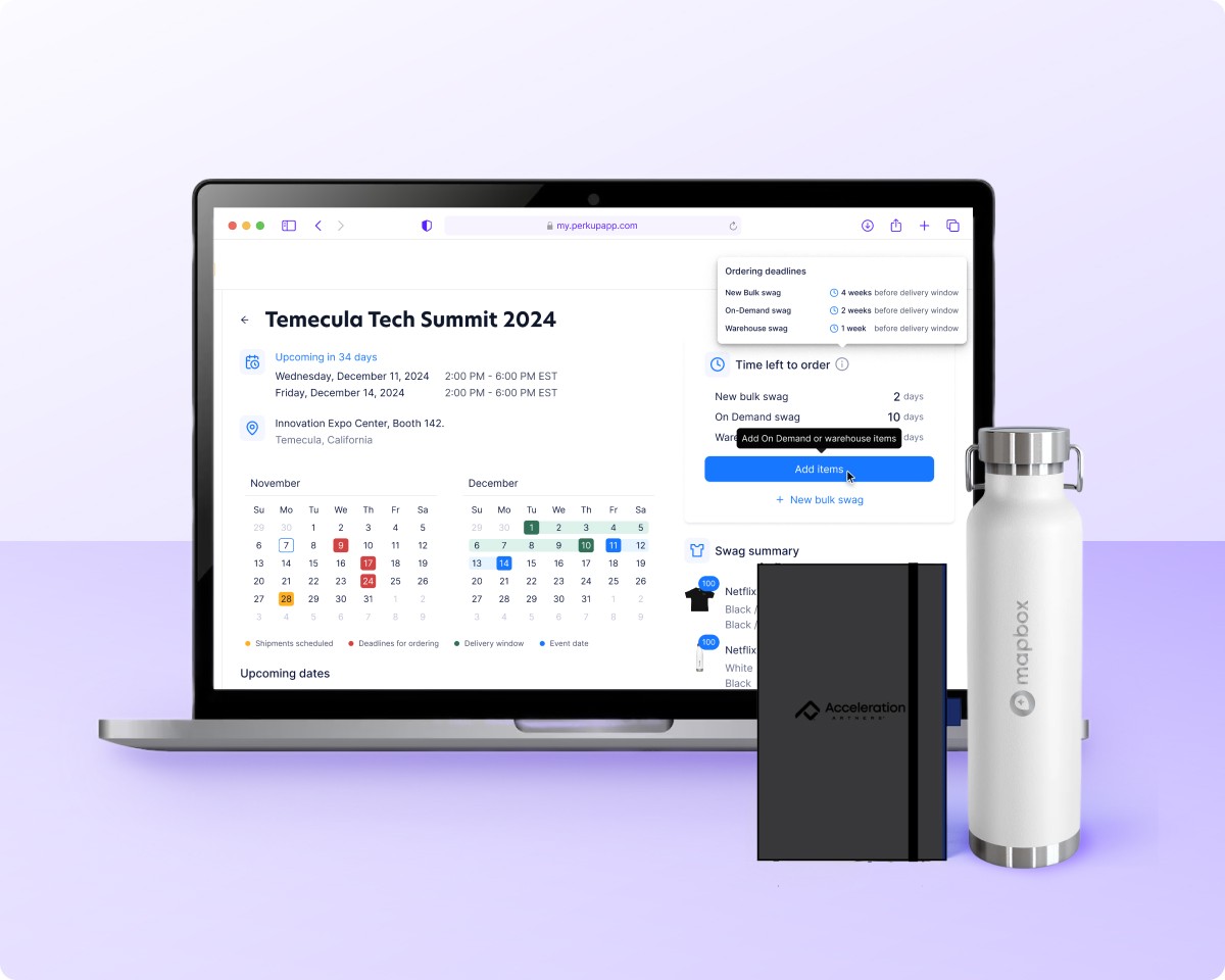 Plan and run marketing events with confidence. PerkUp centralizes global swag and uses regional warehousing to speed delivery and control costs.